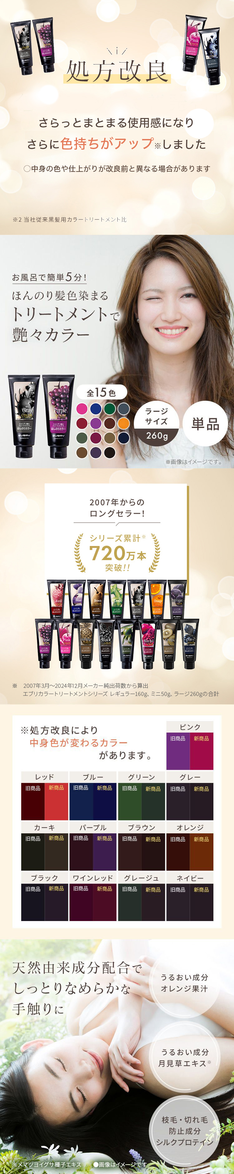 アンナドンナ【本店】 エブリ カラートリートメント 明るい髪に使用した場合 エブリ カラートリートメント 白髪に使用した場合 2,000円(税別)まで 【ヘアカラー商品一覧】 【公式限定】お買い得商品 【公式限定】【お得な大容量】エブリ カラートリートメント ラージサイズ(260g)【おひとり様1日各色10本まで】 価格: ¥1,800 (税込 ¥1,980) [ポイント還元 19ポイント~] 販売期間: 【!】: リニューアルによる中身色・仕上がり色の変更について 変更内容をご確認・ご了承の上お買い求めください。 選択してください 了承しました。 数量: 個 色を選んでください在庫購入ピンク(30398)○ ブルー(30399)○ グリーン(30400)○ グレー(30401)○ レッド(30402)○ パープル(30403)○ ブラウン(30404)○ オレンジ(30405)○ カーキ(30406)○ ワインレッド(30407)○ グレージュ(30408)○ ブラック(30409)○ ネイビー(30410)○ アッシュベージュ(30393)○ アッシュバイオレット(30394)○ 色を選んでください在庫購入ピンク(30398)○ ブルー(30399)○ グリーン(30400)○ グレー(30401)○ レッド(30402)○ パープル(30403)○ ブラウン(30404)○ オレンジ(30405)○ カーキ(30406)○ ワインレッド(30407)○ グレージュ(30408)○ ブラック(30409)○ ネイビー(30410)○ アッシュベージュ(30393)○ アッシュバイオレット(30394)○ 返品についての詳細はこちら \ 2本セットなら送料無料!! / 広告文責:株式会社ダリヤ アンナドンナ事業部 TEL: 052-950-7133 製造販売元:株式会社ダリヤ 区分:日本製・化粧品 アンナドンナ商品 販売名称一覧